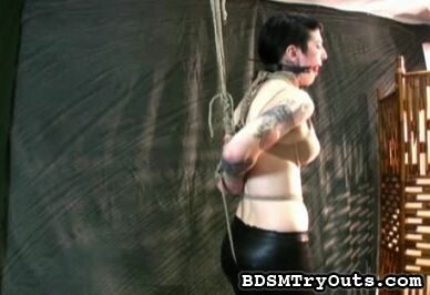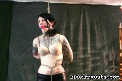 Ava es la estrella de muchos videos de bondage y en este la vas a ver parada con las manos atadas a la espalda mientras su amo le pone una mordaza roja en la boca y la prepara para el castigo. Eso es lo que más le gusta a esta morena de pelo corto tatuada y pervertida, que no hay duda de que va a recibir lo que se merece. No tuvo tiempo de quitarse el sujetador y mostrar sus bonitas tetas, pero al menos podemos ver la expresión de su rostro. Está desesperada y sabe que va a sufrir en las próximas horas y eso está haciendo que su coño esté realmente mojado y listo para algo duro y muy largo. Su amo no le va a proporcionar ese placer ya que quiere verla sufrir y eso es lo que va a pasar. La pobre Ava está más que lista para gritar, pero primero tiene que asegurarse de que sus manos estén bien atadas y de que no pueda moverlas ni las manos ni las piernas.