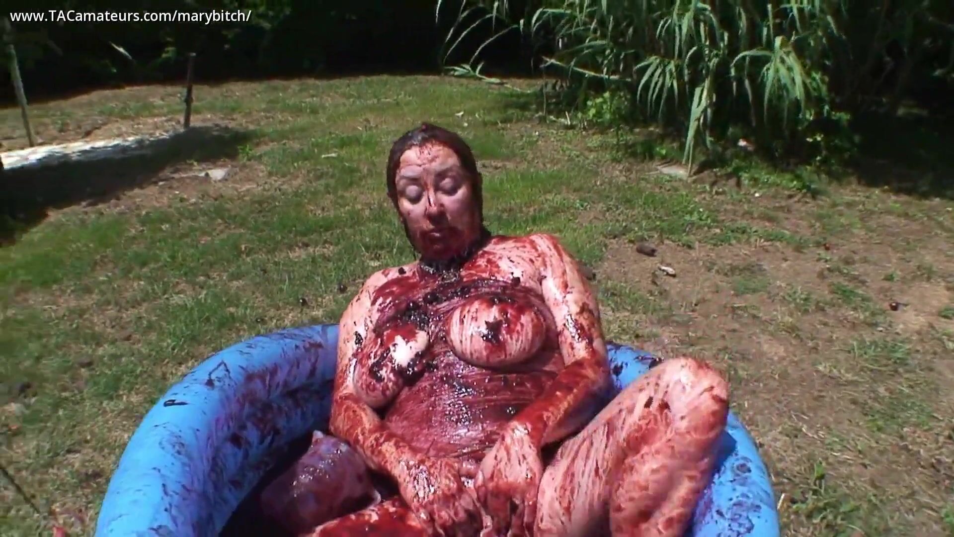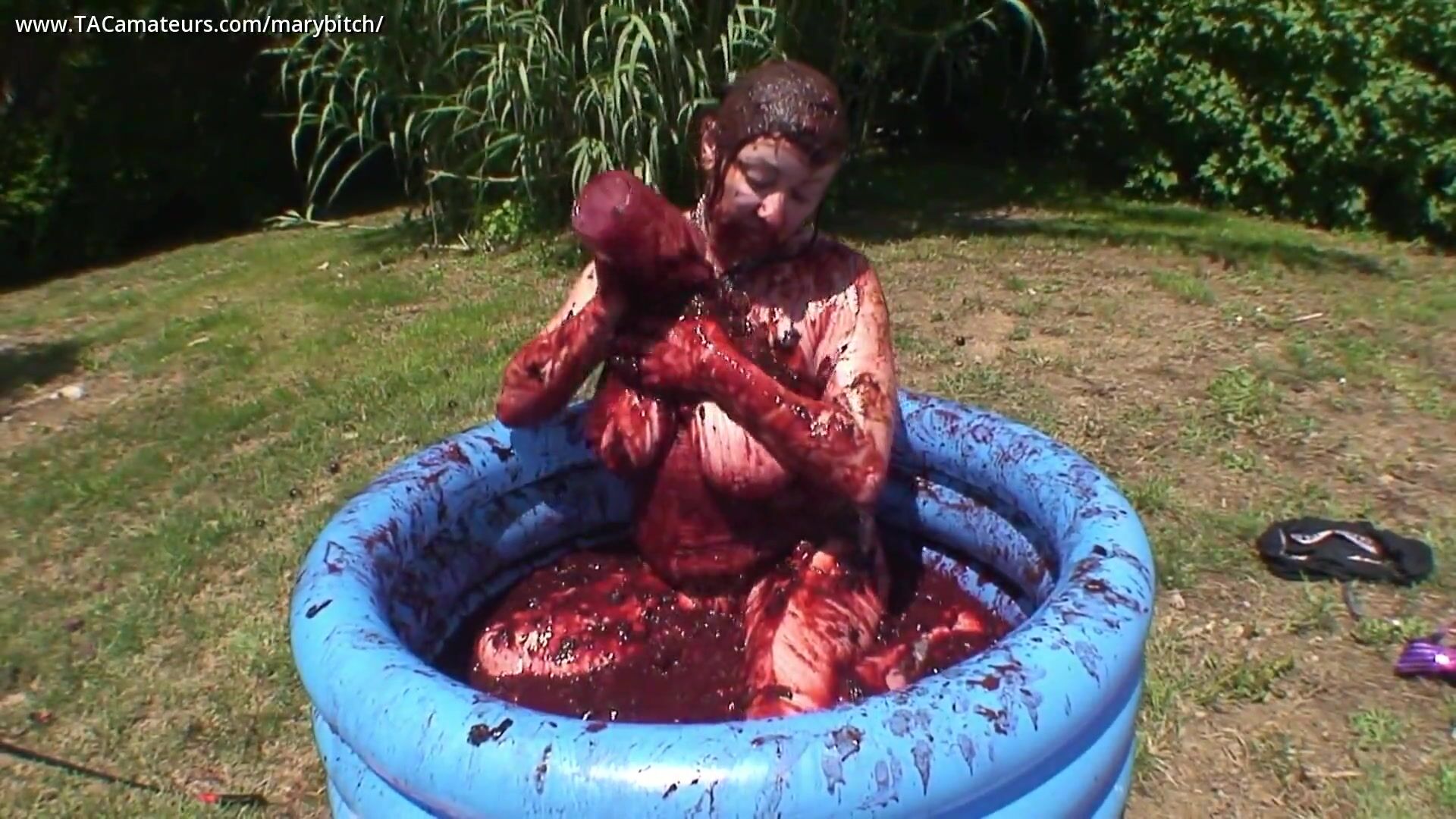 Sigo chupando la polla de mi amo cubierta de mermelada de ciruelas... el se corre en mi boca y vuelvo a la piscina inflable y sigo ensuciándome mientras me masturbo... me encantó este pequeño delirio sucio.