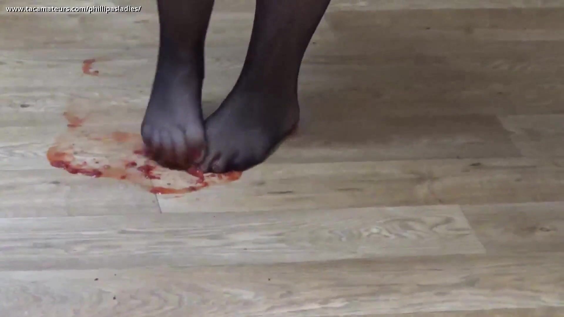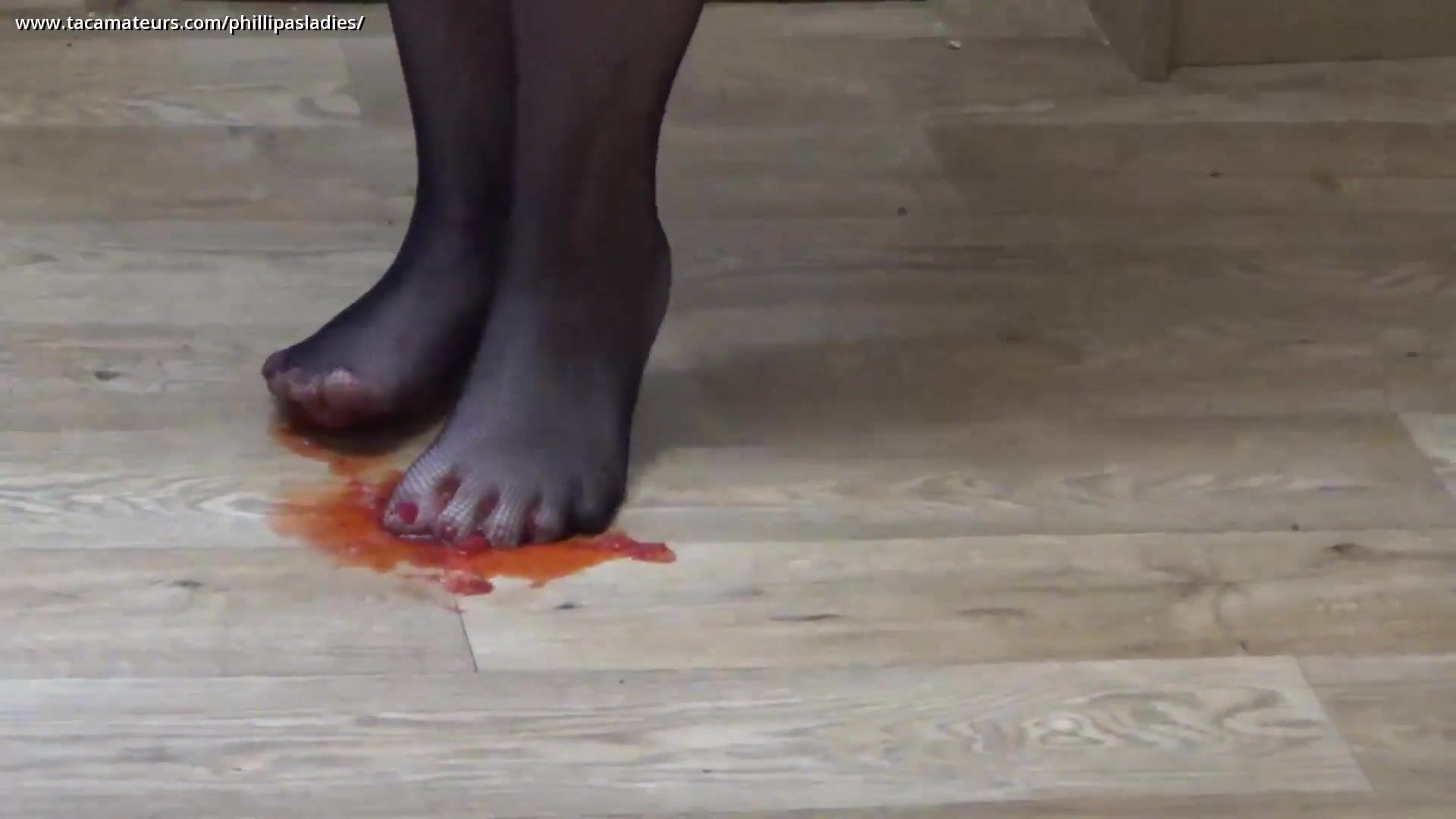 Sara Banks lleva medias y está en topless. Observa cómo aplasta fresas y frambuesas con sus medias que cubren sus pies. Luego agrega crema y la mezcla. Finalmente, se frota un poco en las tetas.