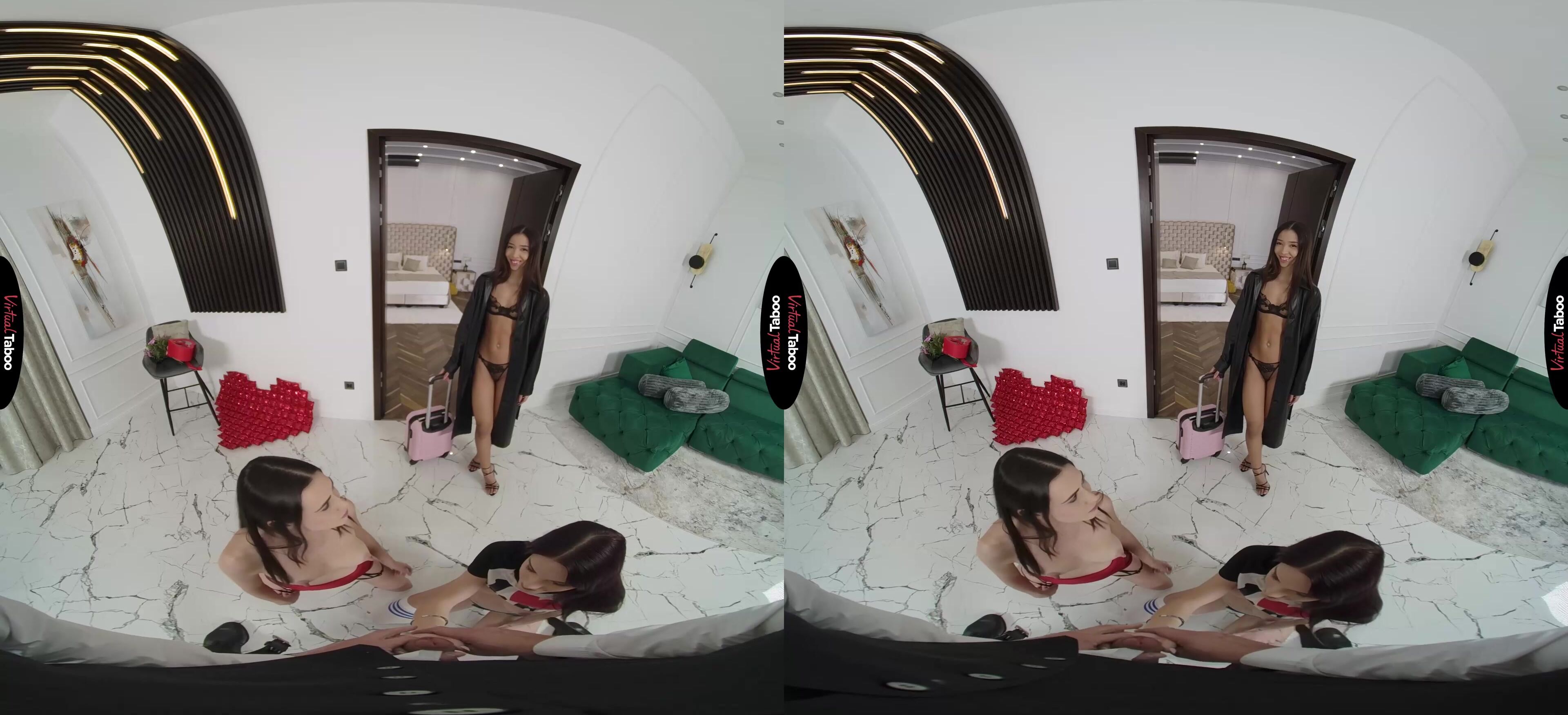 Para el día de San Valentín, Sandralyd quiere hacerle algo muy especial a su novio. Llegas a casa y la encuentras sosteniendo un enorme corazón frente a ella. Cuando lo baja, ves que se ha comprado un sexy vestido rojo tan ajustado que puedes ver todas las curvas perfectas de su cuerpo. También tienes regalos para ella y, mientras los intercambias, no te das cuenta de que tu hermanastra Liz Ocean está mirando. Mientras te ve recibir un espectáculo privado de porno de realidad virtual de tu novia, ella también se quita la ropa para provocarte. Sandralyd está a punto de poner la polla de su hombre en su boca cuando Liz se revela. No tiene cita para el día de San Valentín y está tan celosa que le revela a Sandralyd que está teniendo una aventura contigo. La noticia es impactante, pero en el espíritu de la fiesta romántica y porque ya se sentía cachonda, admite que siempre le ha gustado Liz y está abierta a un trío tabú de realidad virtual pervertido. Las dos chicas cachondas se ponen a chuparte la polla y justo cuando están a punto de follar, se llevan otra sorpresa. Resulta que las engañabas a las dos con Lia Lin, que acababa de aparecer por sorpresa el día de San Valentín. Al principio, todas están bastante molestas, pero ninguna quiere desperdiciar una buena erección, así que te llevan al dormitorio para que te deshagas de tus indiscreciones. Dos bocas son mejor que una, y entonces las tres bocas sobre tu polla son suficientes para hacerte volar por los aires. Se alinean y se turnan, montándote con sus coños apretados hasta que apenas puedes soportar otro momento de placer. Aguantas tanto como puedes antes de disparar una enorme carga de crema para la polla para que la comparta el trío cachondo. Ahora tienes que decidir a cuál de las tres llevar a cenar.