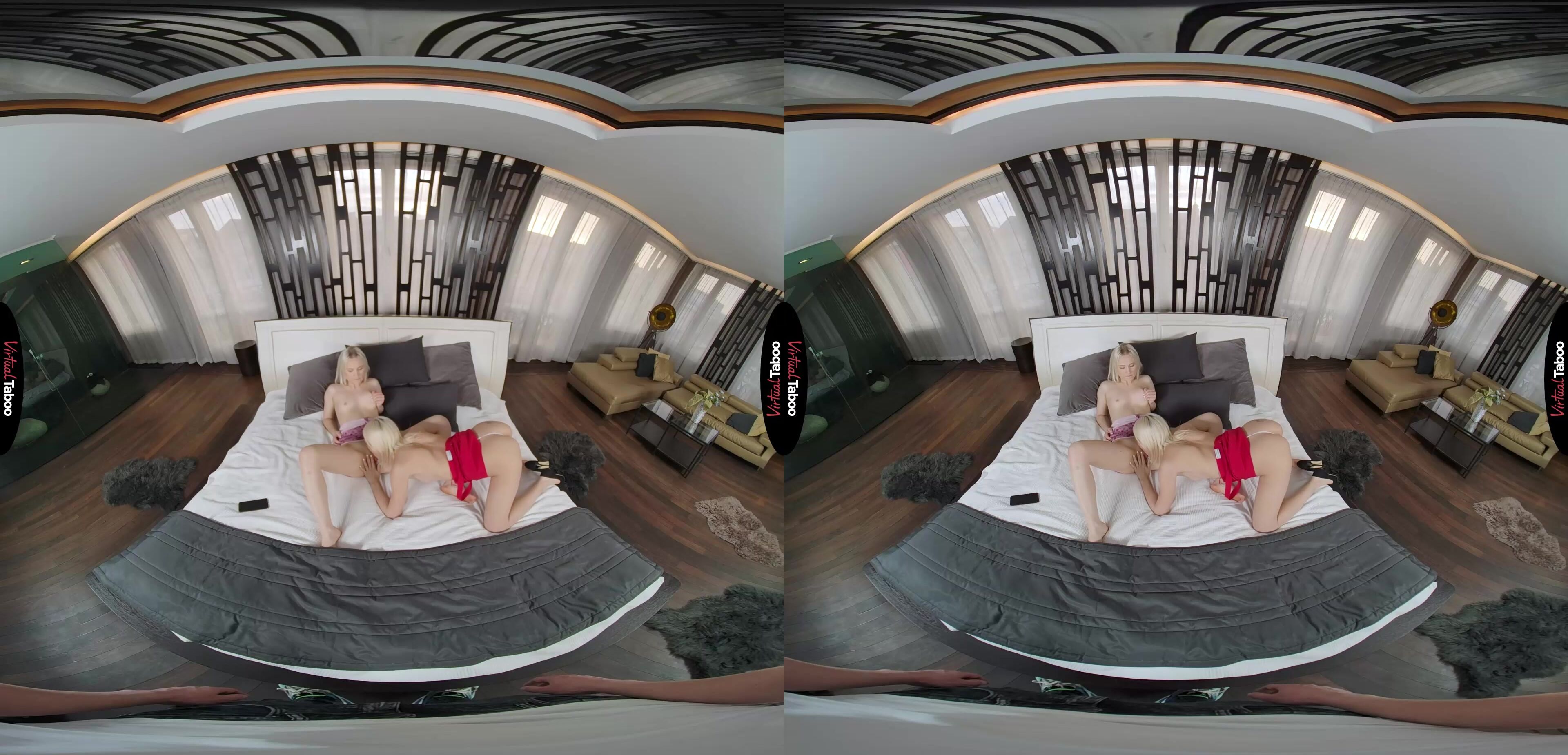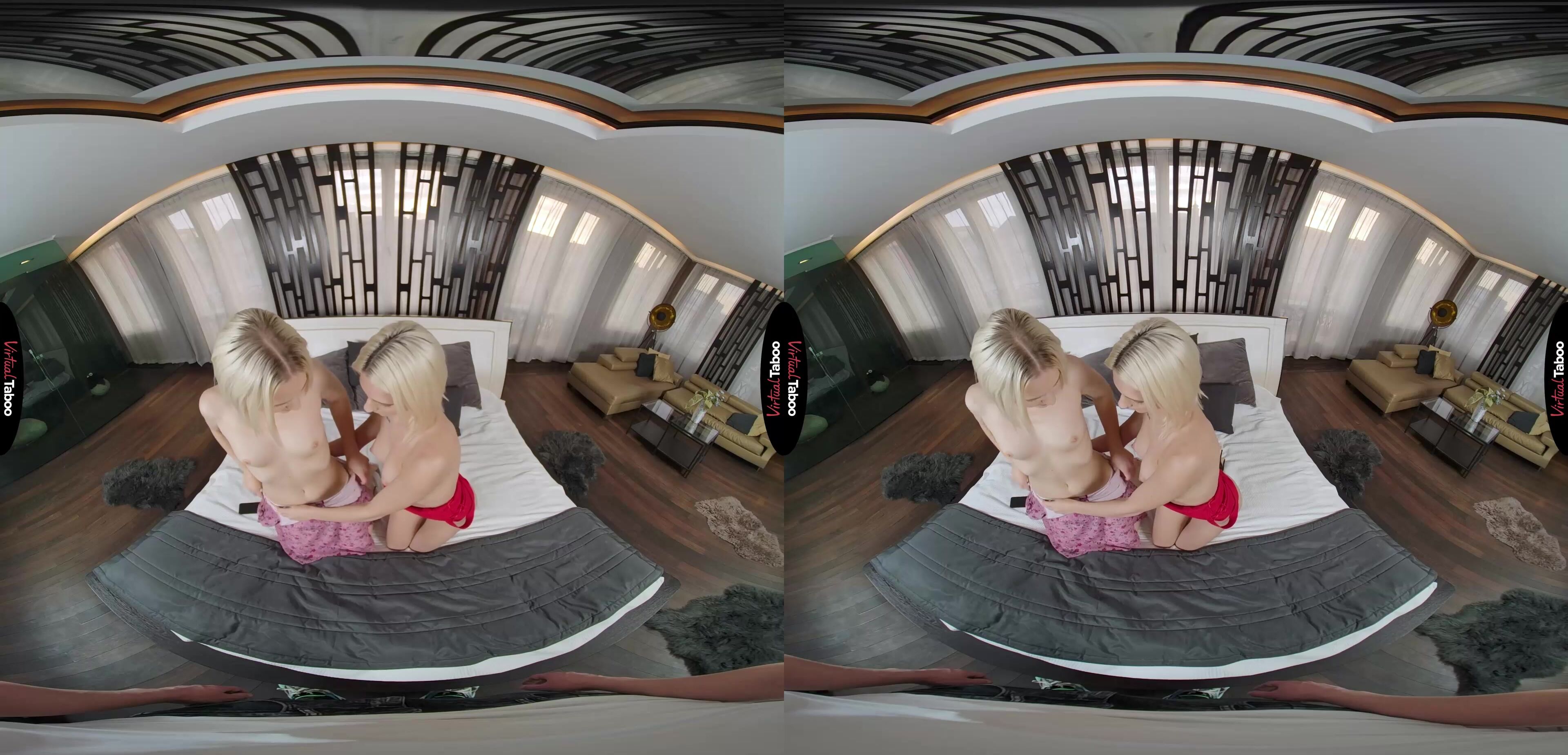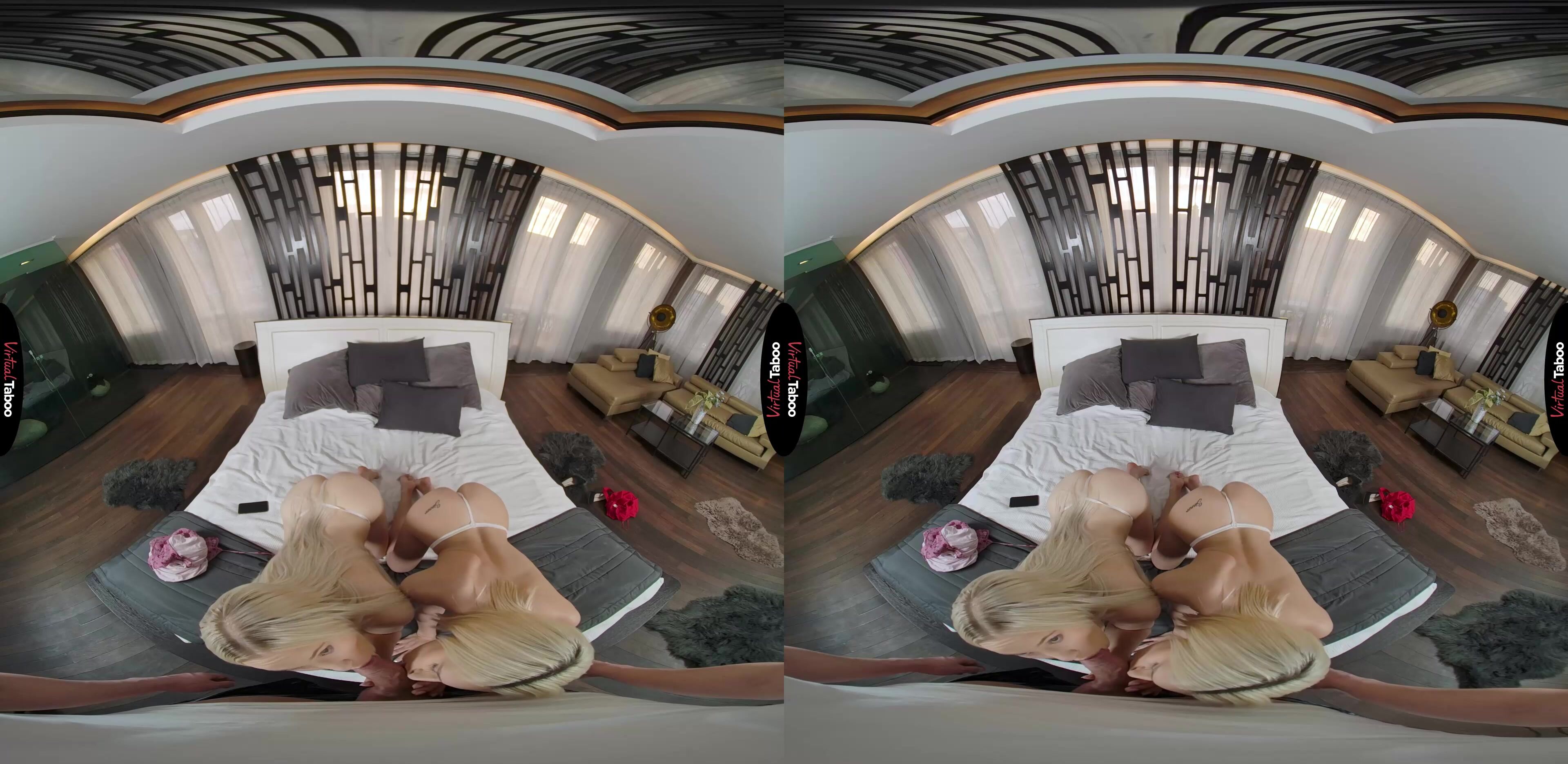 Christy White ha estado saliendo con su novio durante algún tiempo y ha desarrollado un problema grave. Está loca por la hermanastra más joven de su hombre, Nikki Hill. Como ya no está dispuesta a admirarla desde la distancia, va a visitar a su novio cuando sabe que él está con sus amigos. Encuentra a su hermanastra sola en su dormitorio y decide hacer su jugada. Christy está contenta de encontrar a Nikki receptiva a sus avances y está disfrutando de la sensación de su lengua entre sus piernas cuando su hermanastro llega a casa y los descubre. Están avergonzados y un poco asustados de que te enojes, pero aprendes rápidamente que te encanta la idea y estás totalmente dispuesto a un trío con tu ardiente hermanastra. Has visto muchas escenas de porno en realidad virtual, pero ahora puedes vivir tu fantasía de trío con las dos rubias sexys. Comparten tu polla con tu novia y te preguntan astutamente si te la chupa mejor que tu tímida hermanastra. Sabiendo que no debes responder, te turnas para follar a cada chica por detrás, bombeando mientras ellas miran de cerca. Es una vista hermosa y se siente aún mejor cuando te deslizas de un coño apretado al siguiente. Las chicas descubren que disfrutan compartiendo y a Christy le encanta el tabú de ver a su hombre follar a su propia hermanastra. Ella realmente quiere verte correrte dentro de ella, pero tú tienes otras ideas. Siempre has querido una gran corrida facial como en el porno de realidad virtual que amas y las chicas comparten felizmente tu carga. La diversión recién comienza para este chico afortunado.