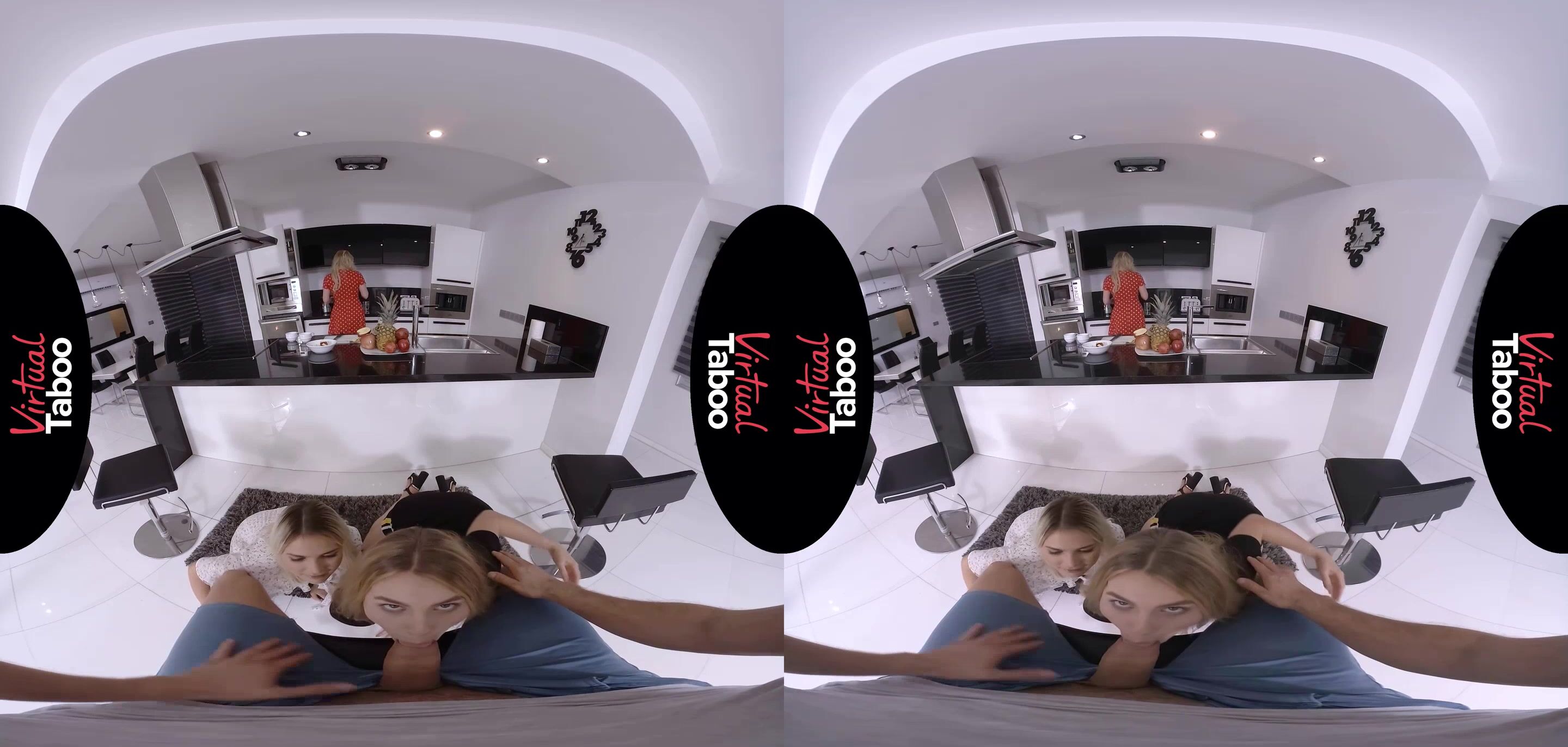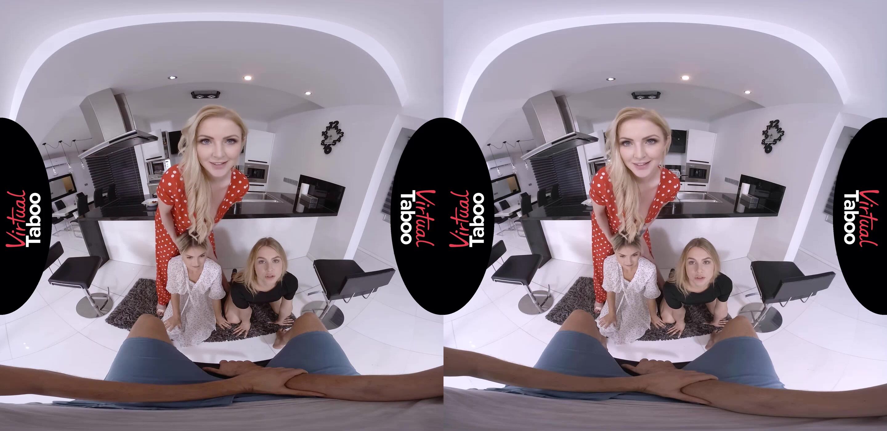 La sexy adolescente Masha invita a su ardiente amiga Alecia Fox a pasar el fin de semana. Las chicas disfrutan del desayuno mientras la madre de Masha, Georgie, y su hermano están en la cocina. Alecia siempre ha pensado que el hermano de su amiga es lindo y convence a Masha para que la ayude a burlarse de él. Con mamá tan cerca, está nervioso, pero realmente interesado cuando las chicas se acercan. Quiere a Alecia y no puede creer que Masha esté de rodillas junto a su amiga. Se equivoque o no, no puede esperar a sentir dos bocas cachondas en su polla y no le importa lo cerca que esté su madre. Sacan su polla y sonríen por lo grande y dura que ya está. Pasándola de un lado a otro, saborean la carne mientras él intenta permanecer callado mientras mamá prepara el desayuno a solo unos metros del libertinaje. No pueden guardar un secreto por mucho tiempo y Georgie pilla a su hija y a su amiga guarra haciéndole una mamada a su hijo. La mamá está sorprendida, pero también ansiosa por unirse a las dos rubias más jóvenes. Una polla de ese tamaño no es nada que se pueda desperdiciar y Georgie quiere enseñar a las chicas cómo chupar correctamente esa gran vara. Las tres se pasan la polla de un lado a otro antes de que Alecia se ponga encima y se la meta en el coño. Masha y Georgie ya están dominados por la lujuria y se comen mutuamente delante de hermano/hijo mientras esperan su turno. Georgie se pone encima, tomando cada centímetro con gran entusiasmo antes de que Masha sea la última, follándose a su hermano hasta que esté listo para explotar. Las dos hermosas adolescentes acarician su polla juntas hasta que explota por toda la boca de la madre guarra.