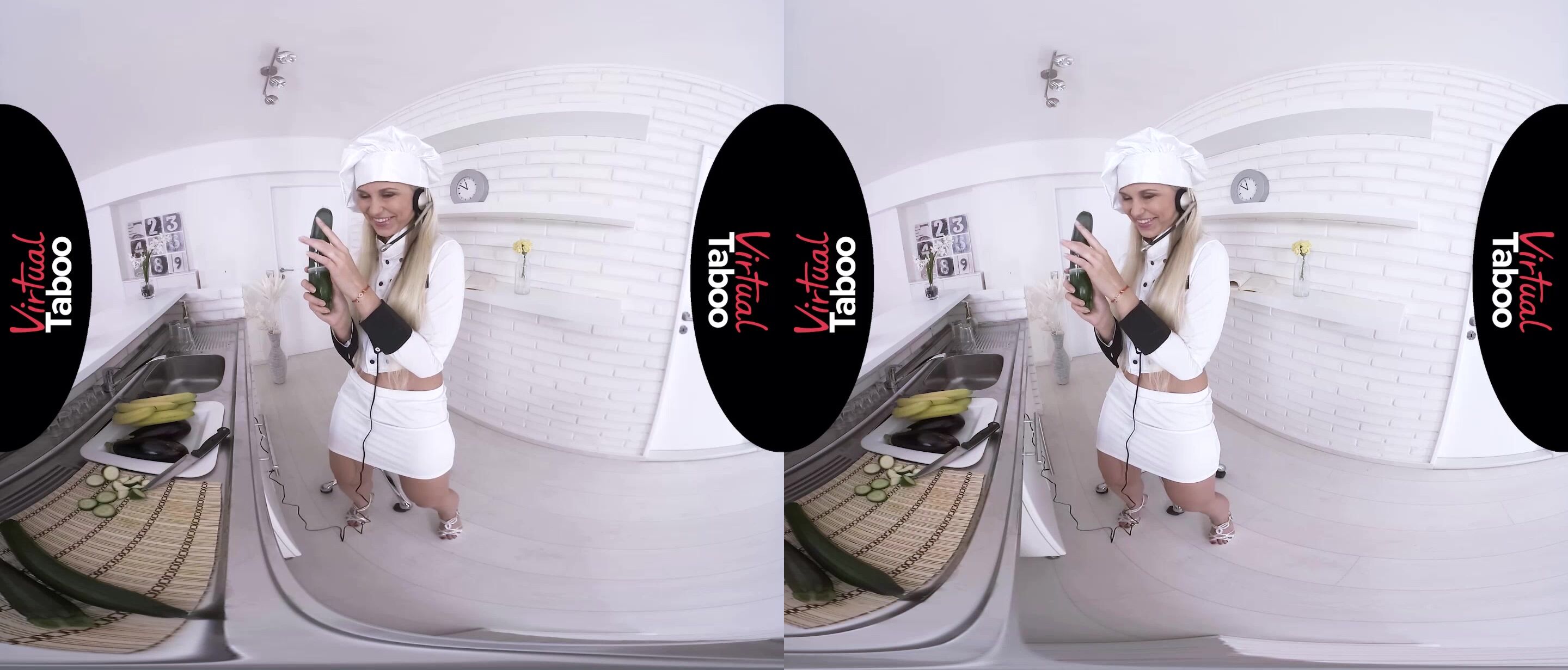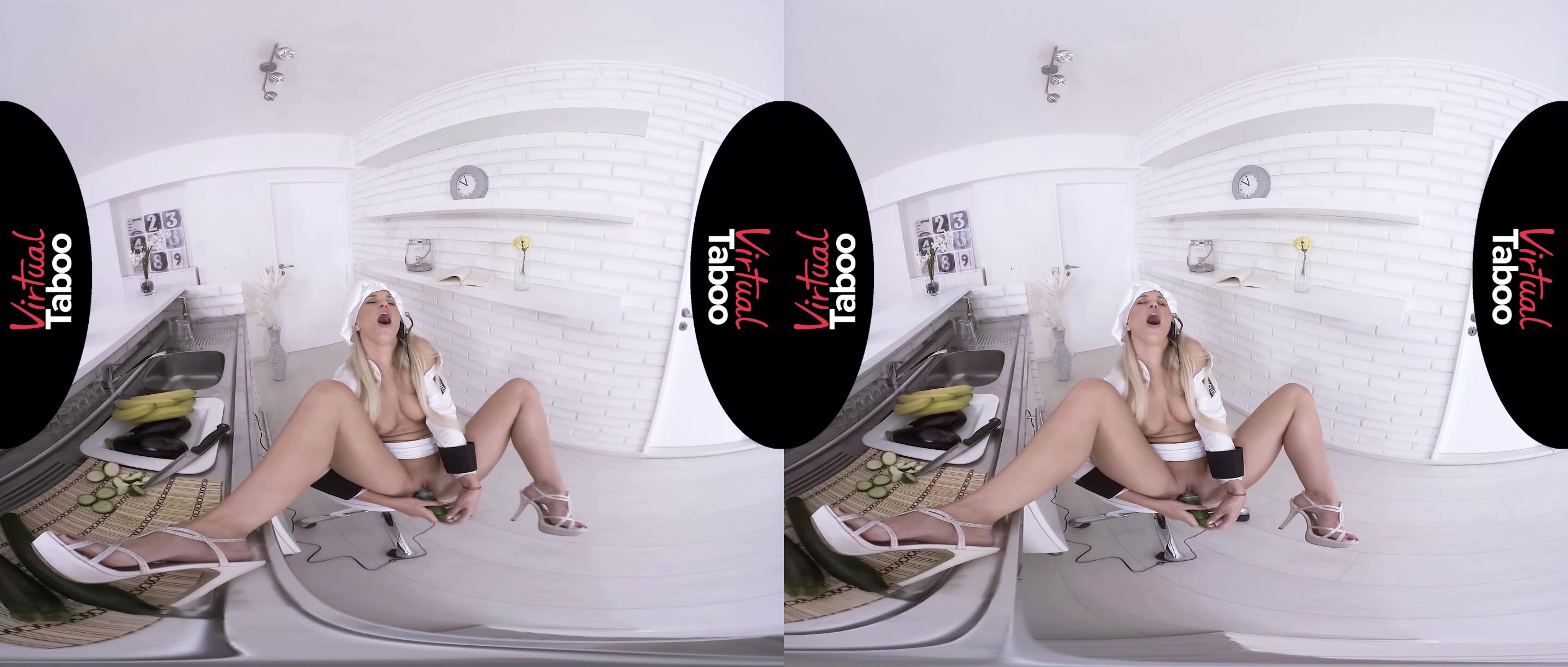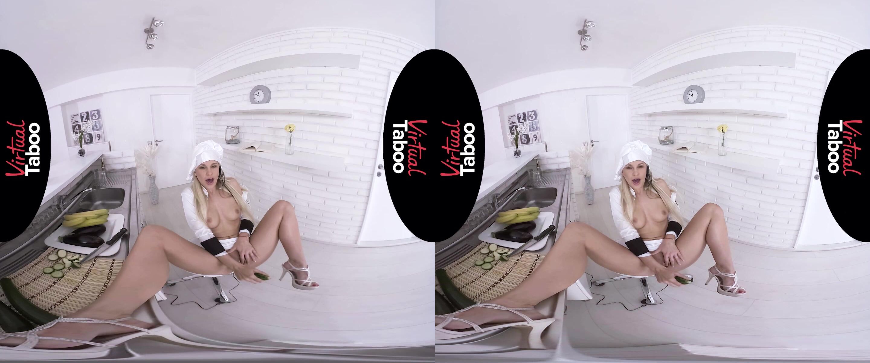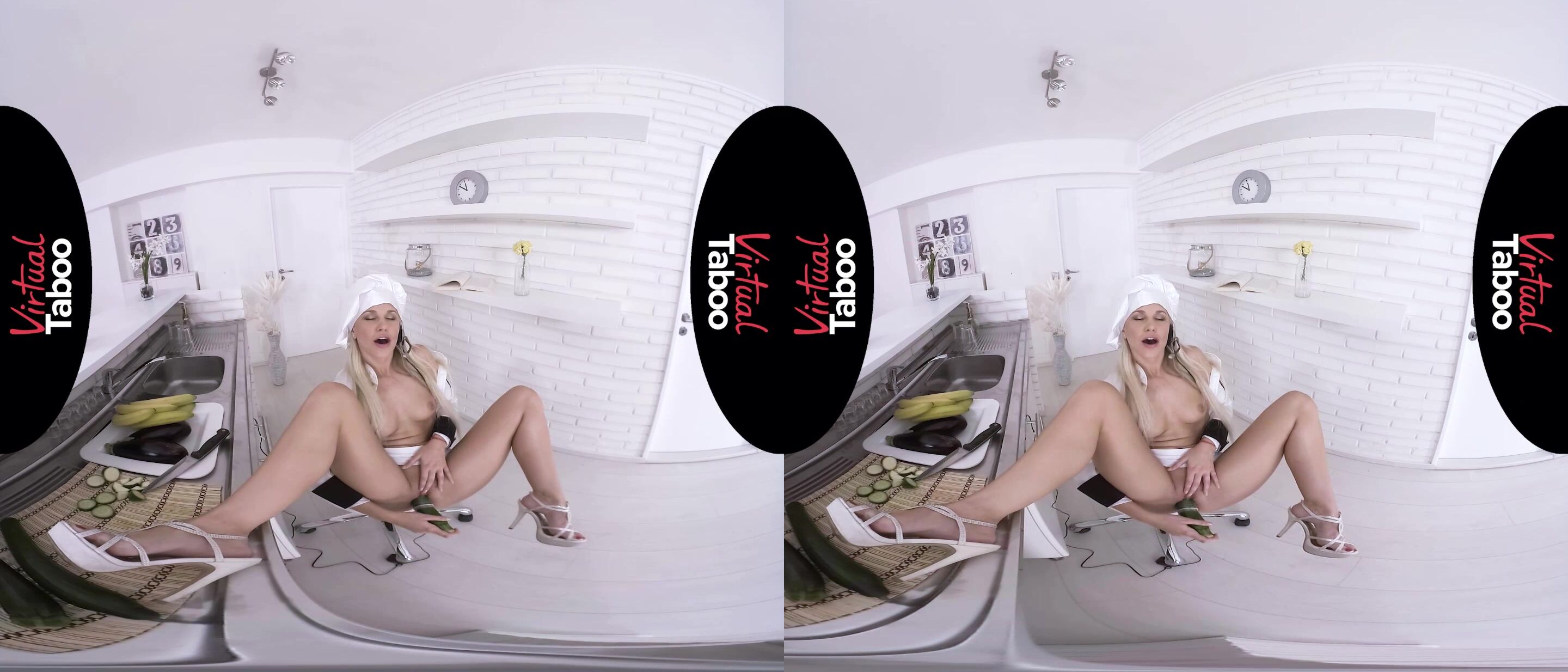 EspañolLa atractiva bloguera culinaria rubia Lola Myluv estaba haciendo una transmisión en vivo de ella misma cocinando un plato especial y, mientras buscaba los ingredientes, sacó accidentalmente un calabacín con un condón. El rubor en su rostro era más que evidente, pero, tratando de mantener el espectáculo, Lola simplemente dijo: "¡Ups, eso fue ayer, pero supongo que podemos repetirlo!". Agarrando la verdura como si fuera un pene erecto, esta deliciosa cocinera deslumbrante se desabrochó la parte superior de su uniforme y dejó que sus pechos redondos salieran. Luego usó el calabacín para jugar con sus pezones protuberantes antes de levantarse la falda y presionarla suavemente contra los labios de su coño. Naturalmente, esto puso a nuestra zorrita Lola aún más cachonda y agitó adecuadamente los jugos de su castor orgásmico. Eso, a su vez, provocó que esta seductora belleza se subiera la falda, se sentara en la silla y abriera sus largas y sexys piernas. Después de usar la verdura con forma fálica para frotar su clítoris, esta delgada belleza la dejó penetrar lentamente en las profundidades de su coño ya empapado. Al moverla hacia adentro y hacia afuera, la deslumbrante Lola no pudo evitarlo y dejó que sus lujuriosos labios se abrieran mientras un gemido primario de placer se escapaba de ellos. Aumentando tanto la velocidad como la intensidad de la perforación de su coño afeitado, esta maravillosa bomba sexual pudo sentir que se acercaba un fuerte orgasmo. Y, cuando finalmente llegó a su cuerpo apretado, Lola se estremeció con el inmenso placer antes de terminar la transmisión que satisfizo por completo tanto a ella como a sus espectadores.