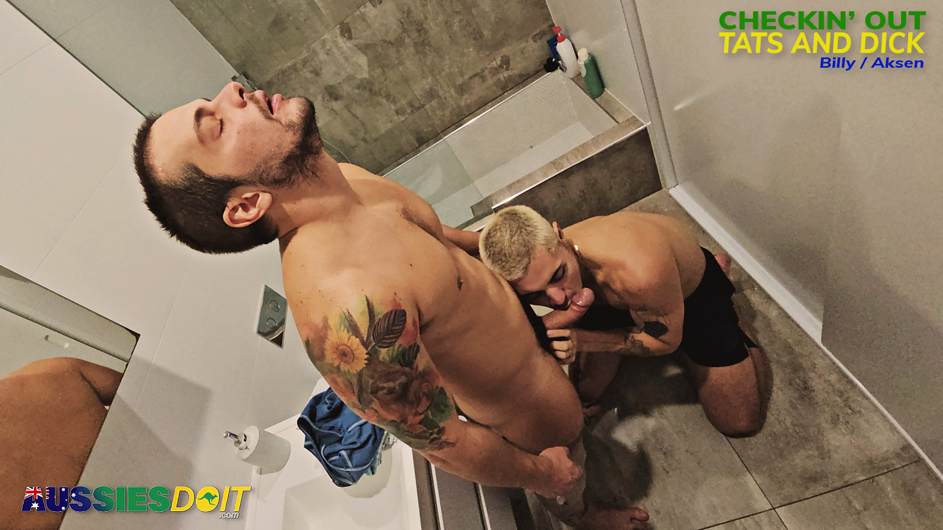 El cachondo musculoso Aksen y el rubio Billy, un amigo playero, se conocen por primera vez antes de su debut en la pantalla grande, y ambos tienen la oportunidad de presumir y hablar de sus variados y coloridos tatuajes. Cuando Aksen se desnuda para mostrar las partes cubiertas, a Billy se le ocurre echarle un vistazo a su enorme y potente polla. Aksen no se opone, sujetando la cabeza de Billy mientras se la folla hasta el fondo de su garganta hambrienta de polla. Cuando el placer se vuelve demasiado intenso y advierte: "¡Creo que me voy a correr!", Billy lo sorbe hasta el límite y se lleva un buen bocado para recordarlo antes de su encuentro XXX de acción total.